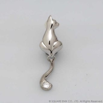 Le design est un chat, et la queue du chat détermine la boucle ondulante qui fait le pendant du bijou. Au bout de ce pendant, un petit brillant, de visu je dirais que la pierre serti est un zirconium !